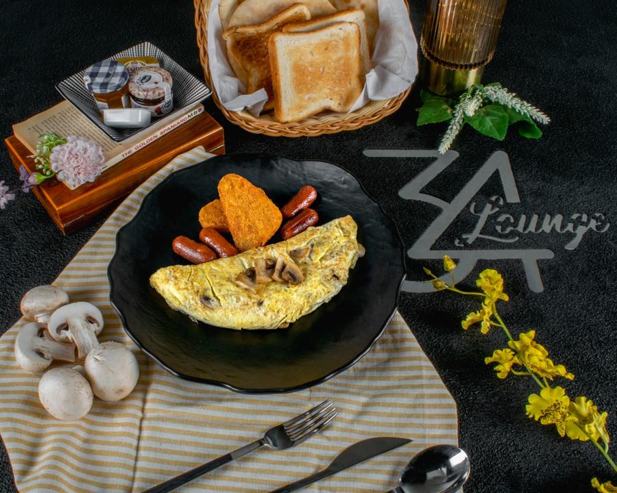 Egg Omlette with Mushrooms served with Beef Sausage, Has brown Potato, Jam. Butter and Honey, Homemade Bread and Toasted Bread.