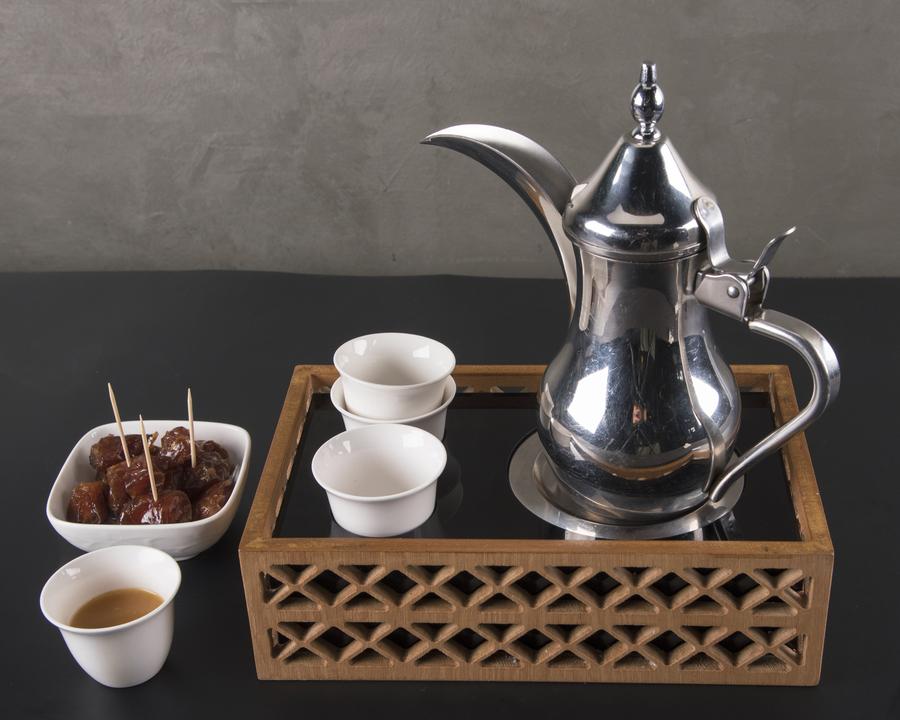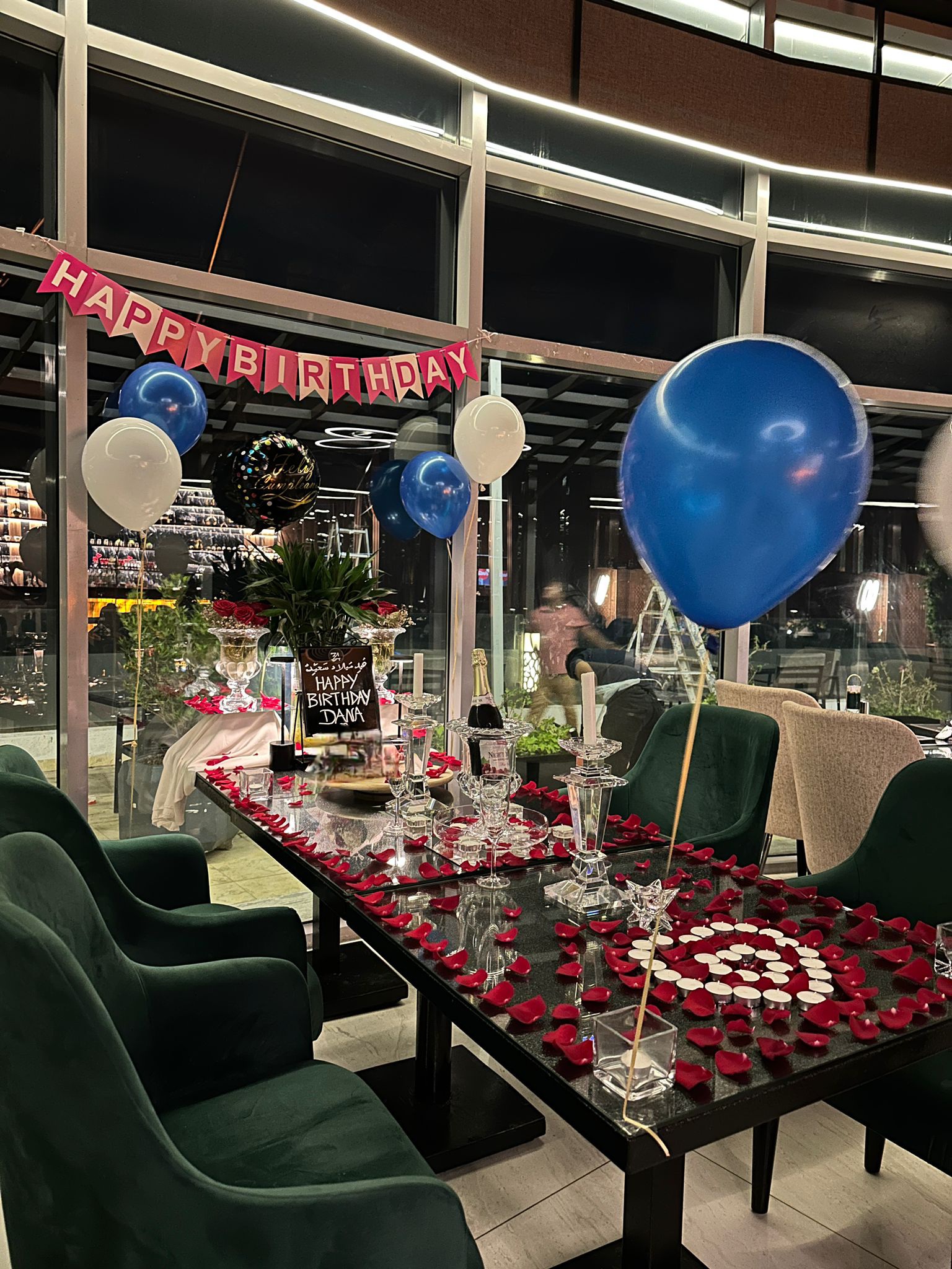 A specially decorated premium Birthday table ( for 4-6 persons) with fresh flower petals, candles and aloons. Served with lovely Chocolate cake Red velvet cake, Sparkling Grape juice and traditional Arabic coffee.