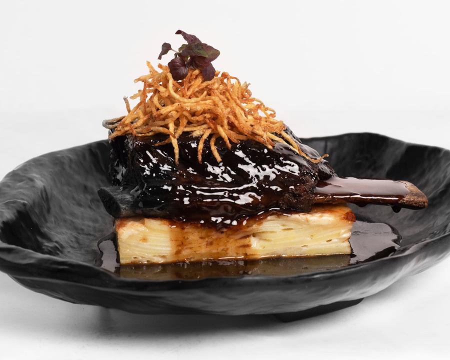 Marinated pot roast short ribs served with mashed potatoes and cheddar cheese slice topped with cola glaze sauce.
