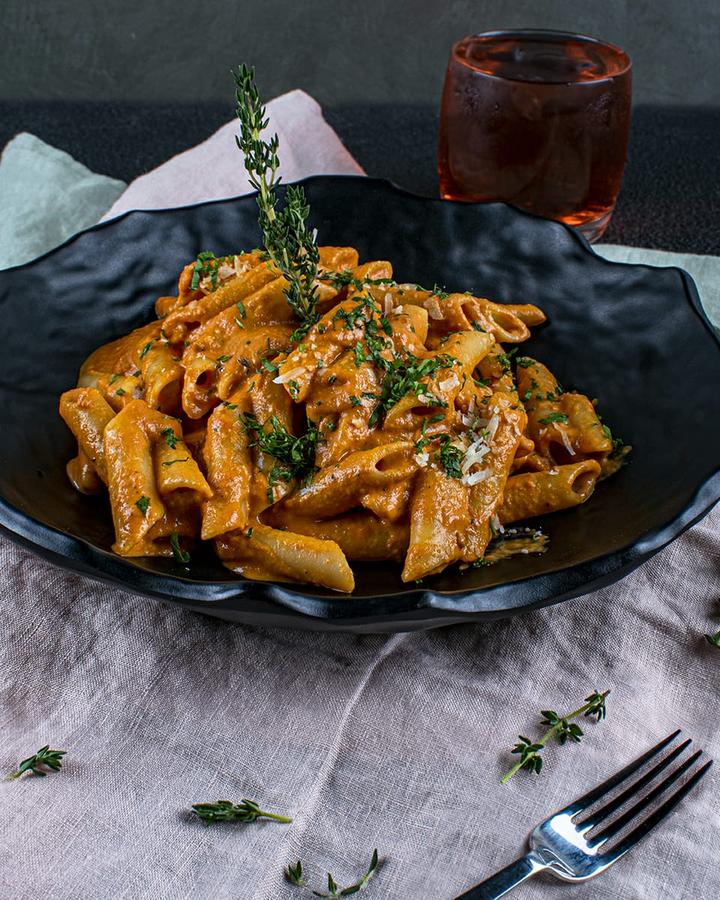 معكرونة بالصلصة الوردية تقدم مع جبن البارميزان و ورق الريحان (يضاف الدجاج -1000 او الجمبري 1.500)