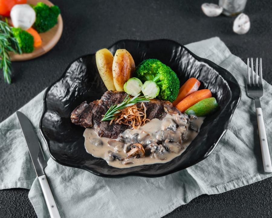 Charcoal grilled sirloin steak served with asparagus, broccoli, carrots, Brussels sprouts, roasted potatoes and mushroom sauce topped with crispy onion and rosemary.