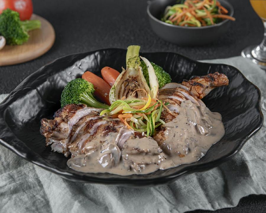 charcoal grilled chicken breast served with boiled vegetable broccoli,carrot,fennel cherry tomato and mushroom sauce