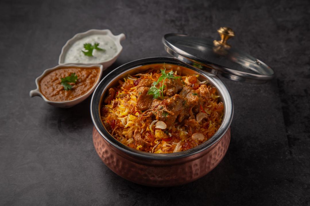 أرز بسمتي مطهو مع التوابل الهندية التقليدية والدجاج المسحب يقدم مع صلصة الكاري وزبادي الخيار.