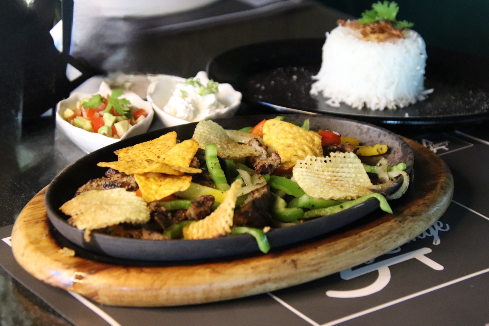 لحم بقري متبل ومقطع ومقلي في مقلاة مع البصل الأبيض والفلفل الحلو المختلط ويقدم في مقلاة ساخنة مع الأرز الأبيض أو البطاطس المقلية والكريمة الحامضة وصلصة الأفوكادو.