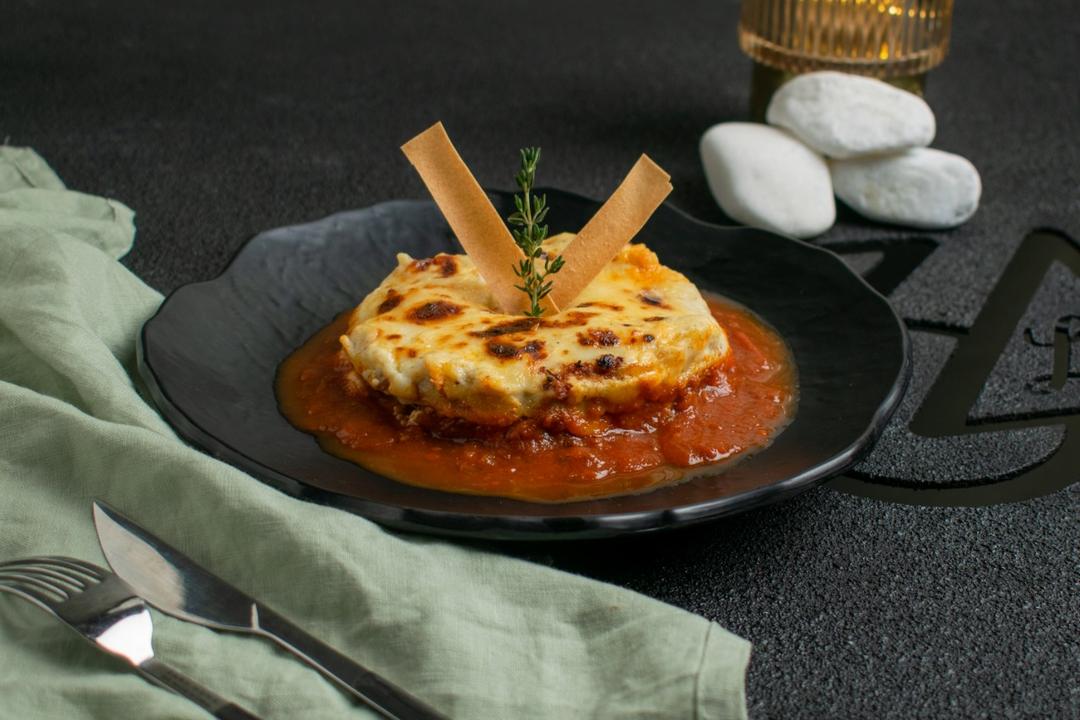 Pasta sheets with meat and tomato sauce topped with mozarella cheese baked in oven.
