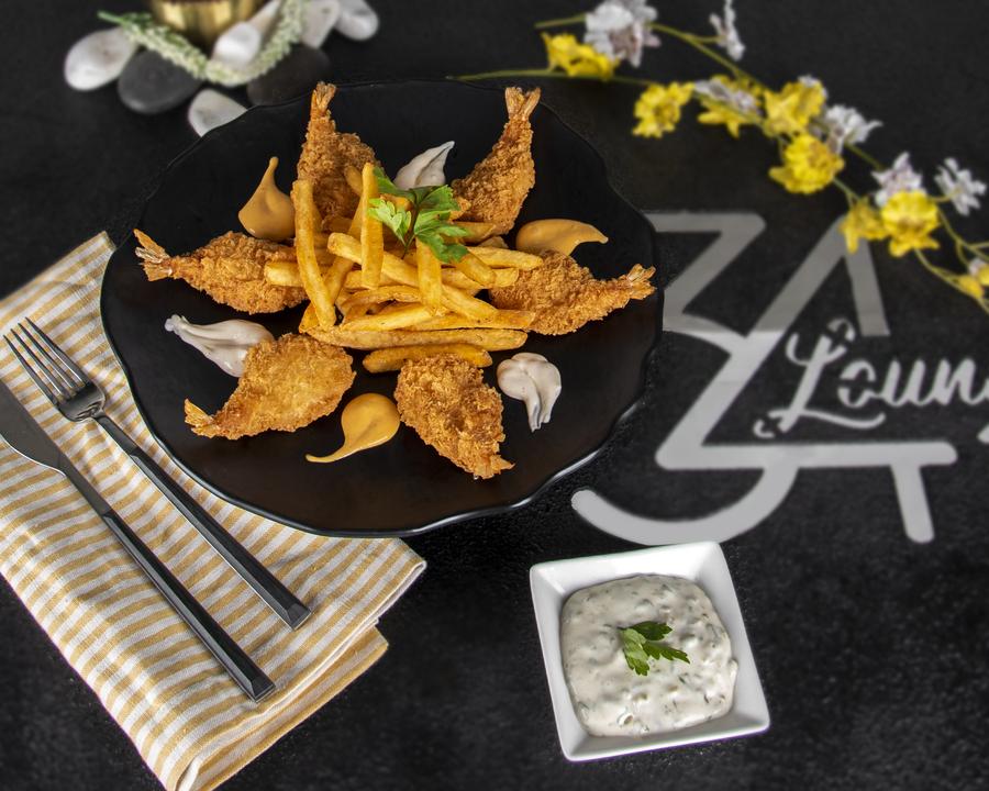 Breadded golden shrimps served with crispy French fries and Remolet sauce on the side.