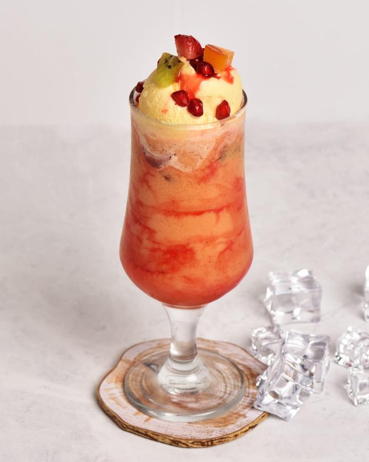 Delicious dessert with heady aroma and flavour of Safron served with safron sauce topped with whiping cream.