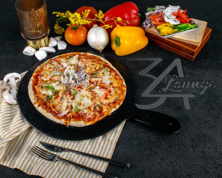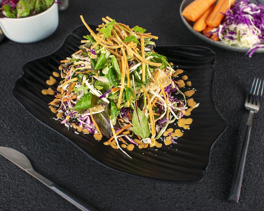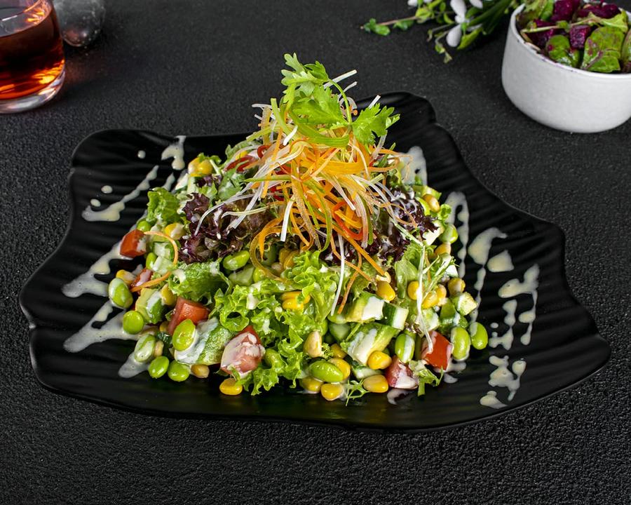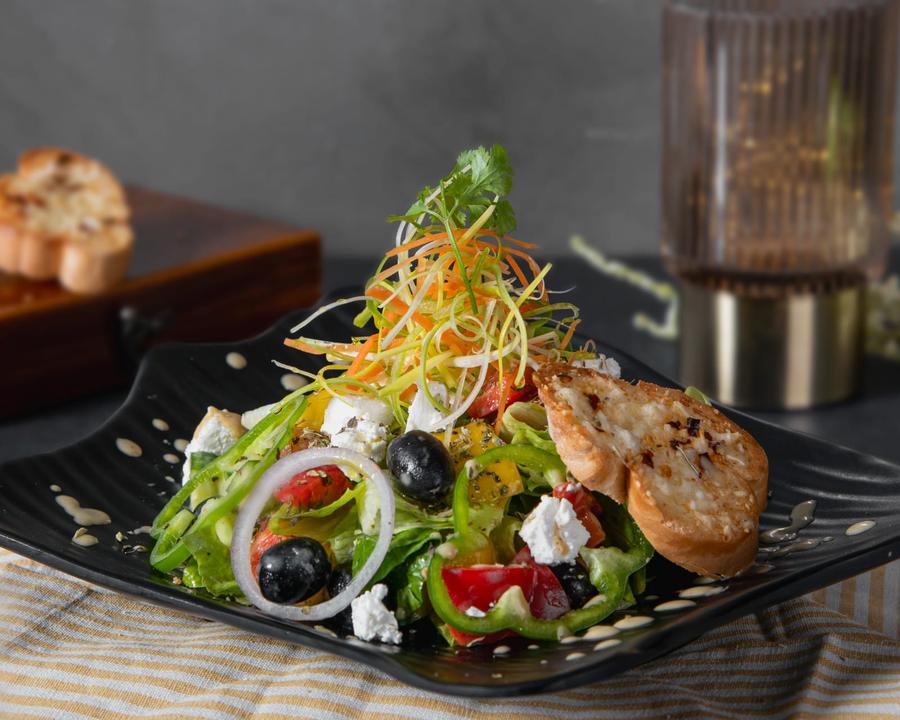 ROMAN LETTUCE, TOMATO, GREEN CAPSICUM, YELLOW CAPSICUM, RED CAPSICUM, CUCUMBER, RED ONION, KALAMATA OLIVES, FETA CHEESE TORCHED WITH VENEGRATE DRESSING SAUCE TOPPED WITH MAGIC VEGETABLES AND SPRINKLED OREGANO.