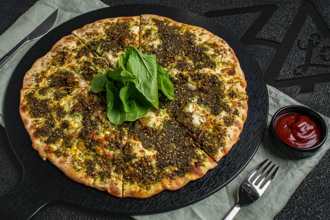 معكرونة تقدم مع صلصة البيستو ، مع اضافة جبنة البارميزان وزيت الريحان وأوراق الريحان الطازجة (أضيفي الدجاج -1000 أو أضيفي الجمبري 1.500)