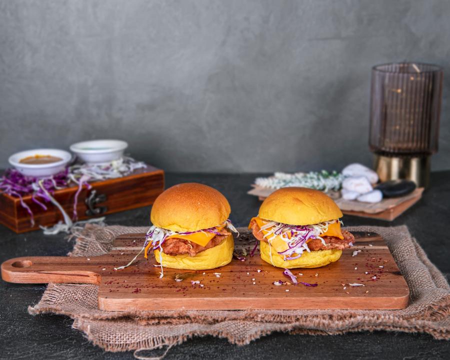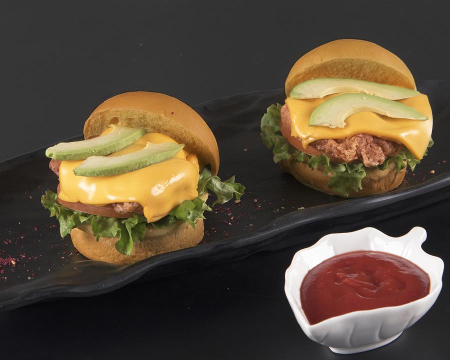 crispy golden fried chicken topped with avocado, gratin with yellow cheddar cheese.