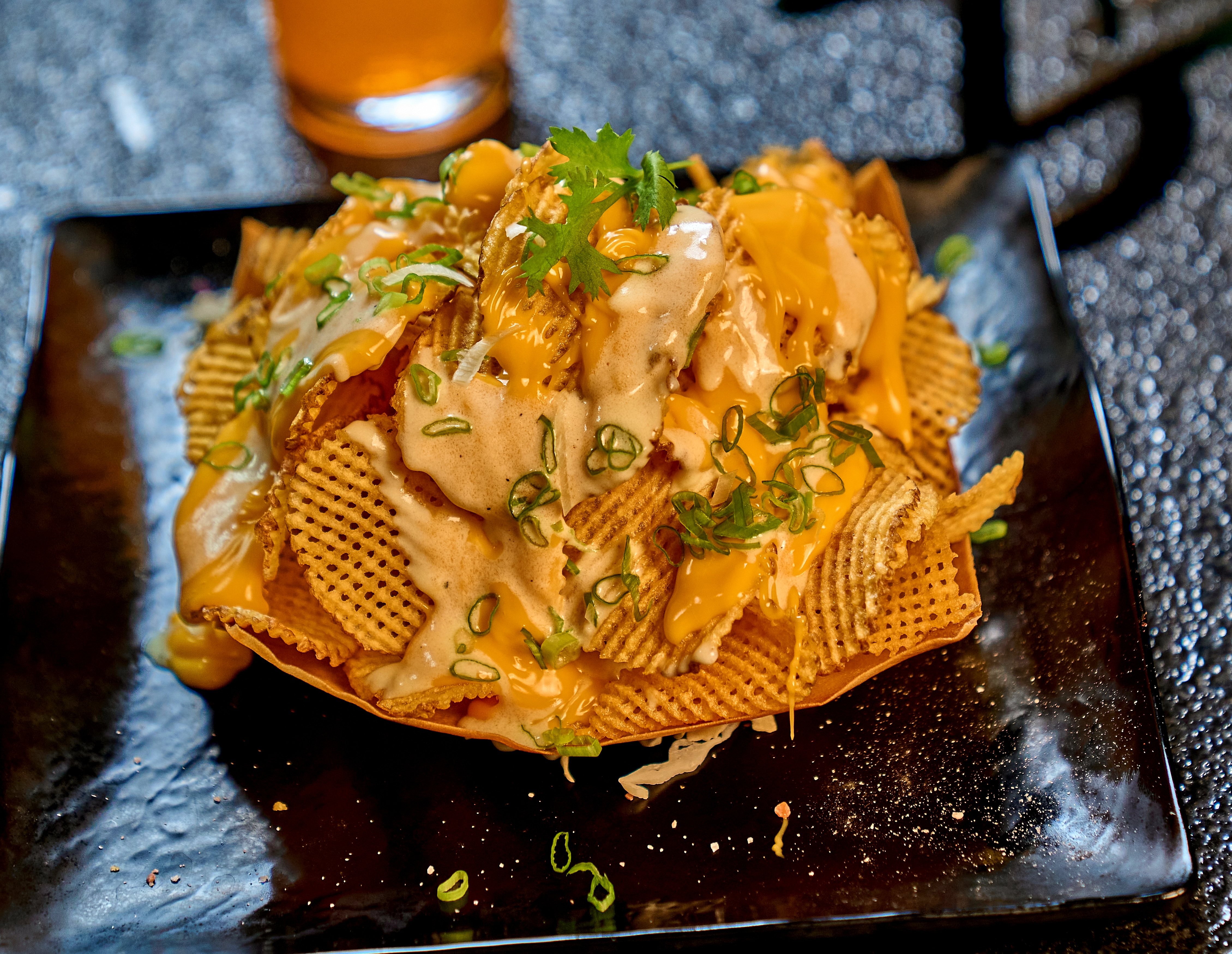 French fries with yellow cheddar cheese,on the top jalapeno and roasted panku bread crump