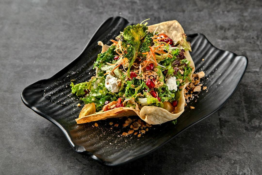 ملفوف أحمر ، ملفوف أبيض ، خليط أخضر ، جزر ، خيار ، محروق في 34 صالة خاصة تقدم مع خبز التورتيلا وجبنة البارميزان والكزبرة