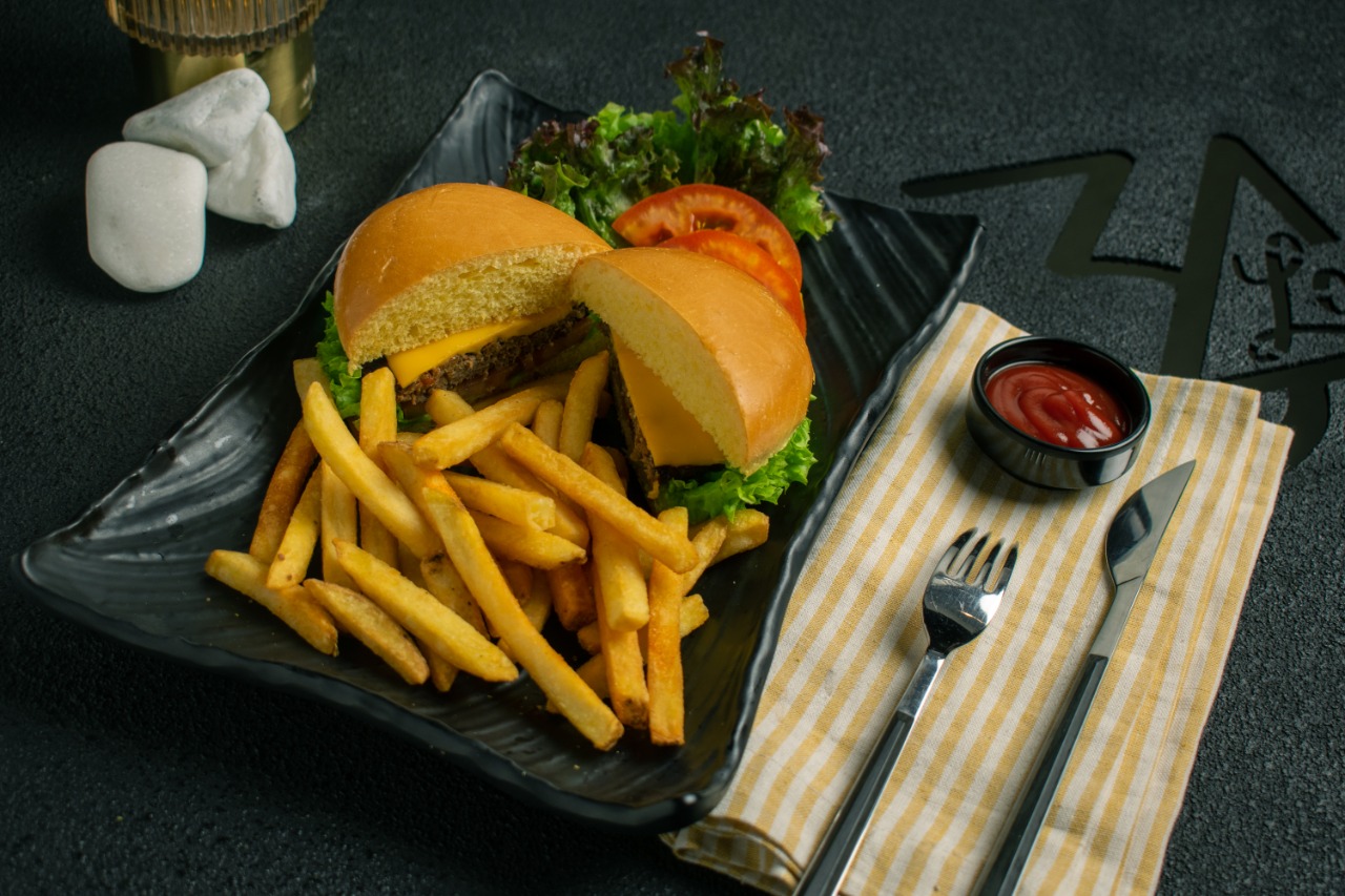 beef pate,lettuce,onion,cheese,beef beacon and eggs served with French fries