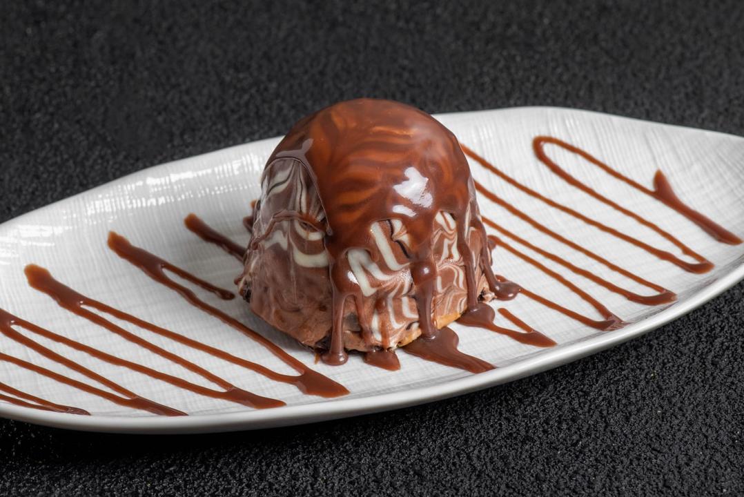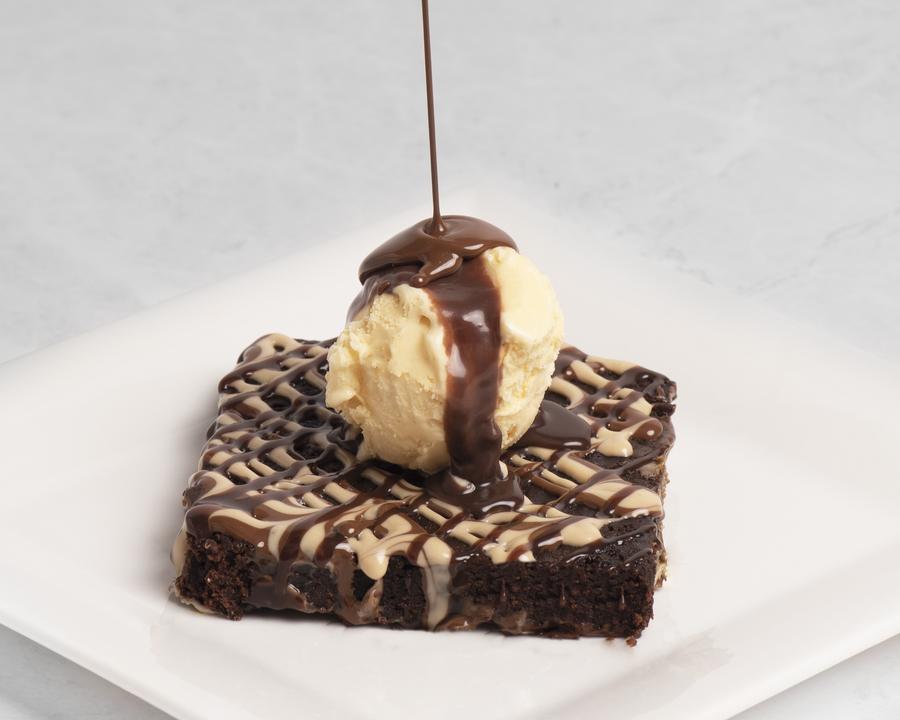 براوني خاص بيتي تقدم مع ايس كريم مغطاة بصوص الشوكلت.