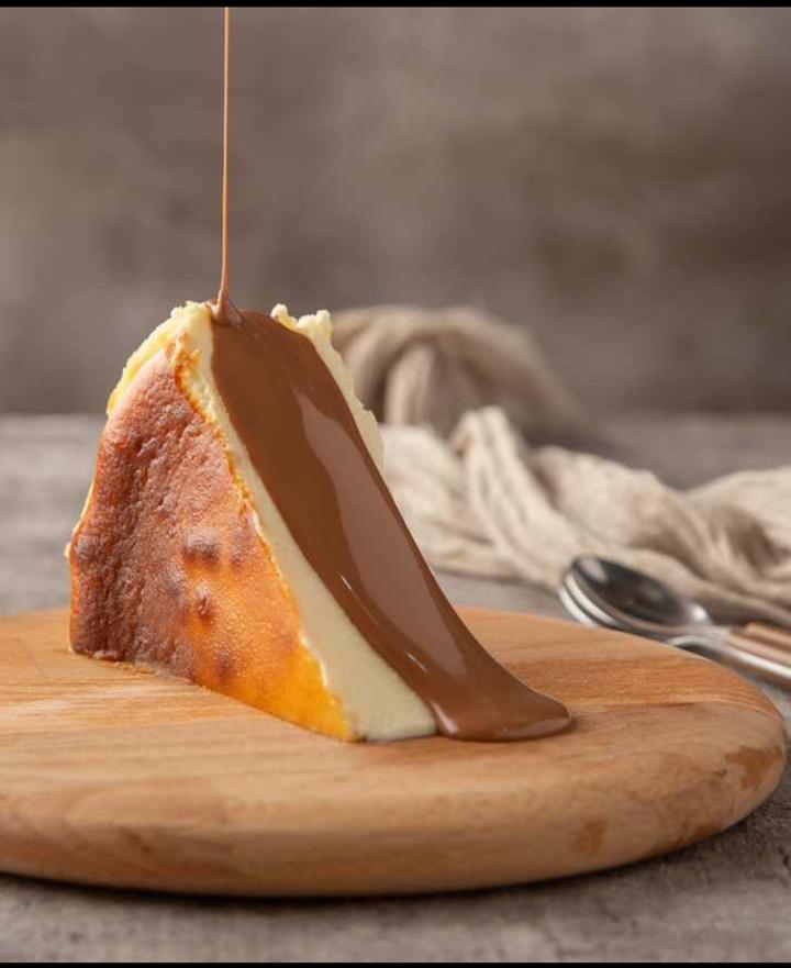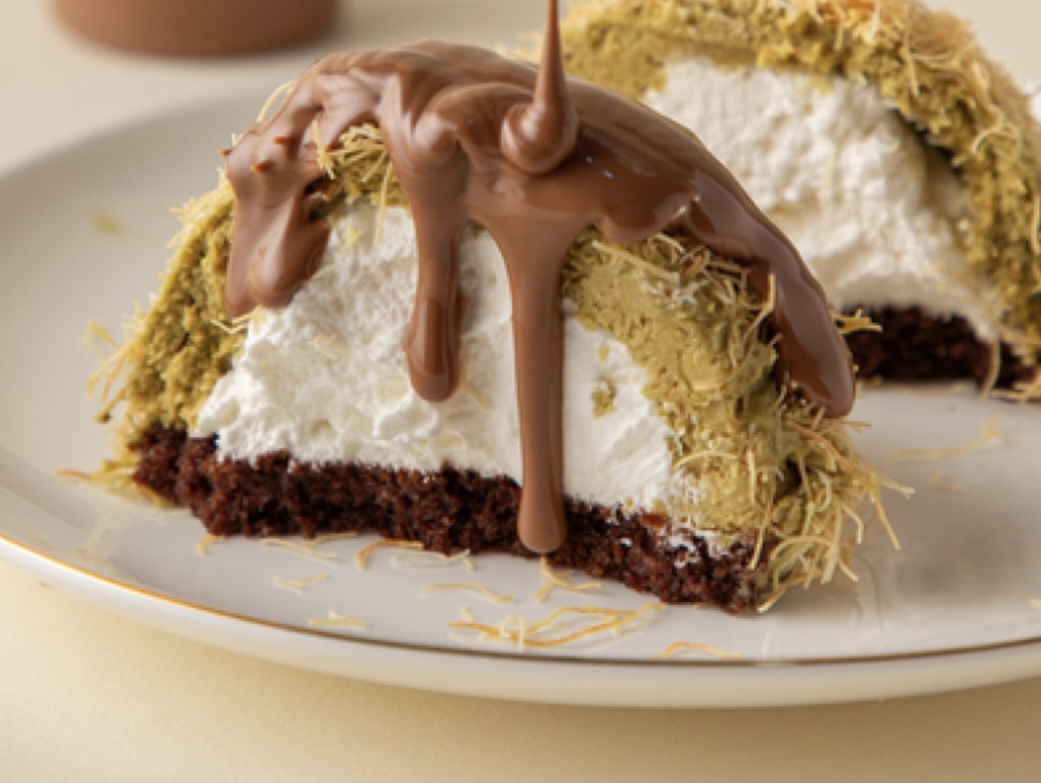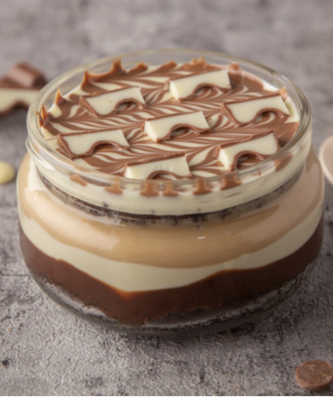 Layers of thin cocoa cake with chocolate and kinder sauce topped with kinder grains._