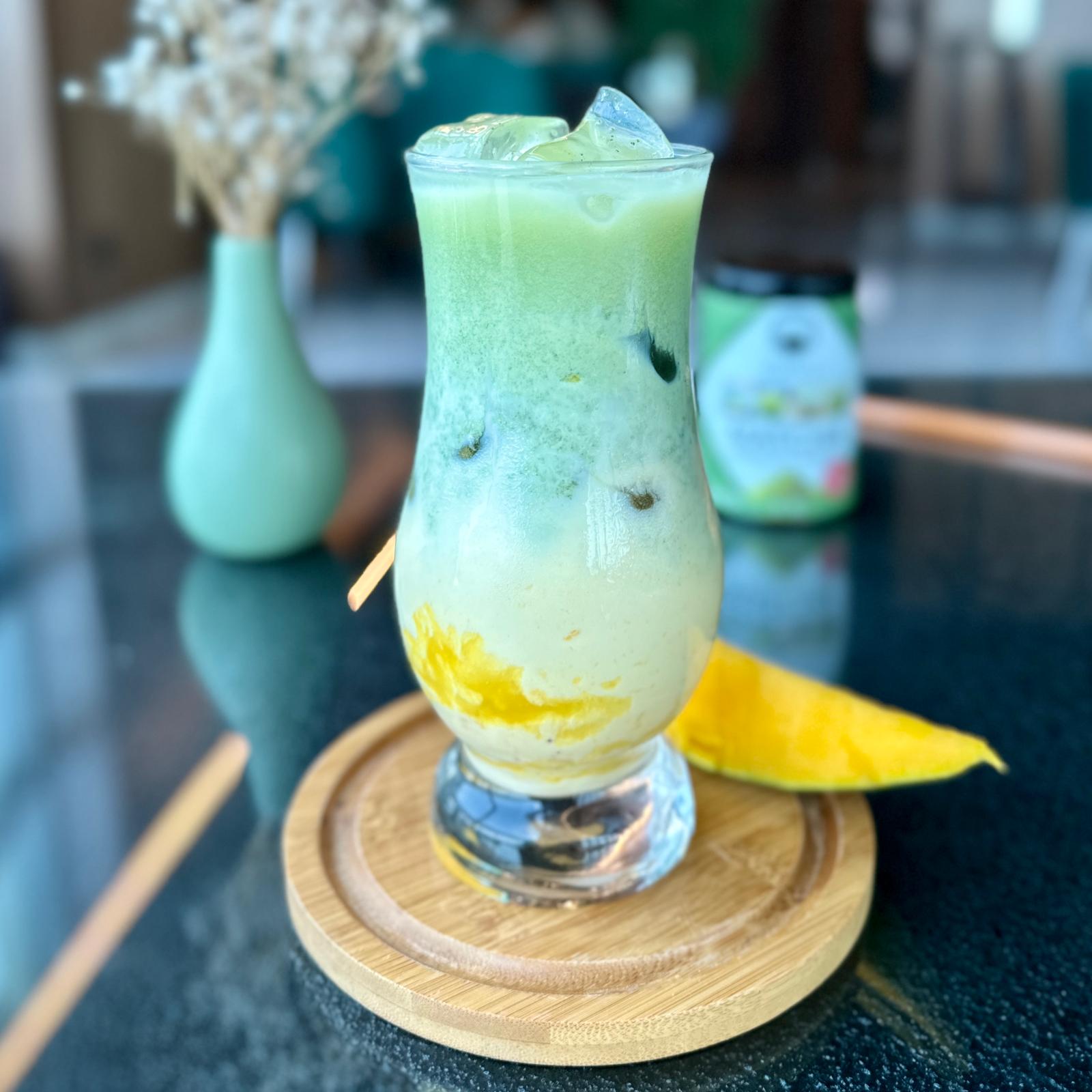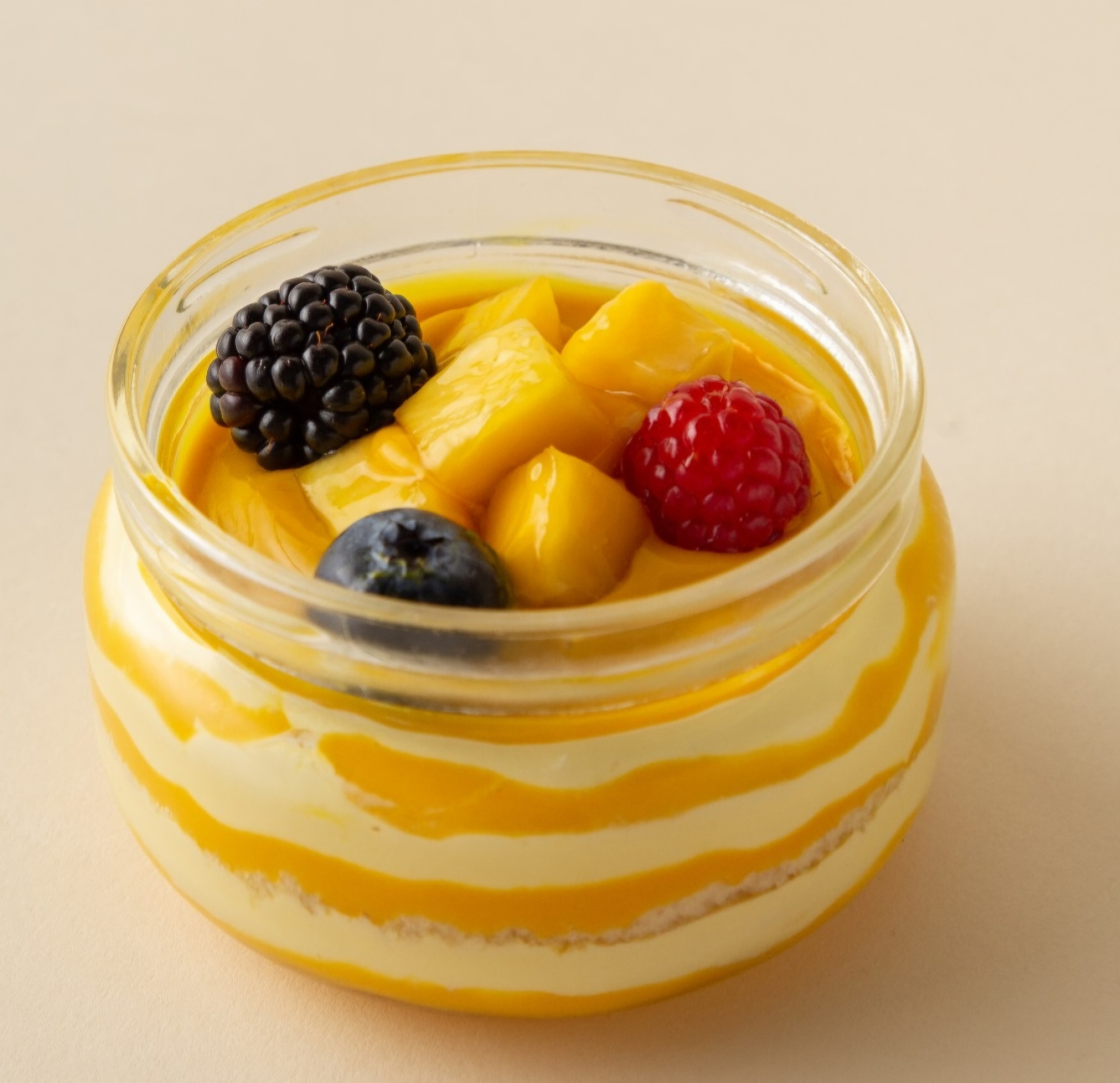 طبقات من كعكة الفانيليا مع حشوة المانجو الطبيعية وقطع المانجو الطازجة والتوت.
