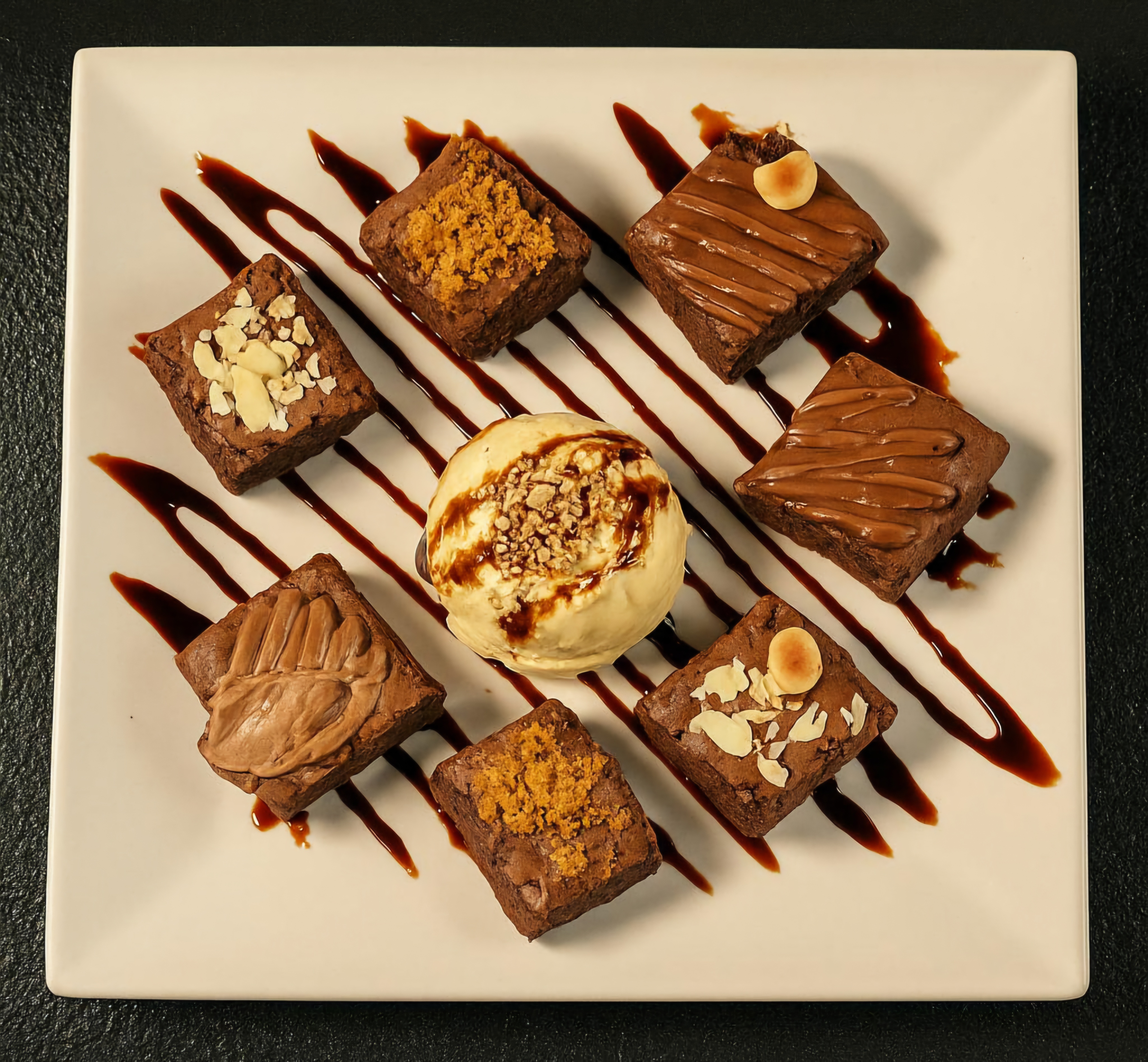 Bite-sized assorted brownie cubes served with a scoop of classic vanilla ice cream