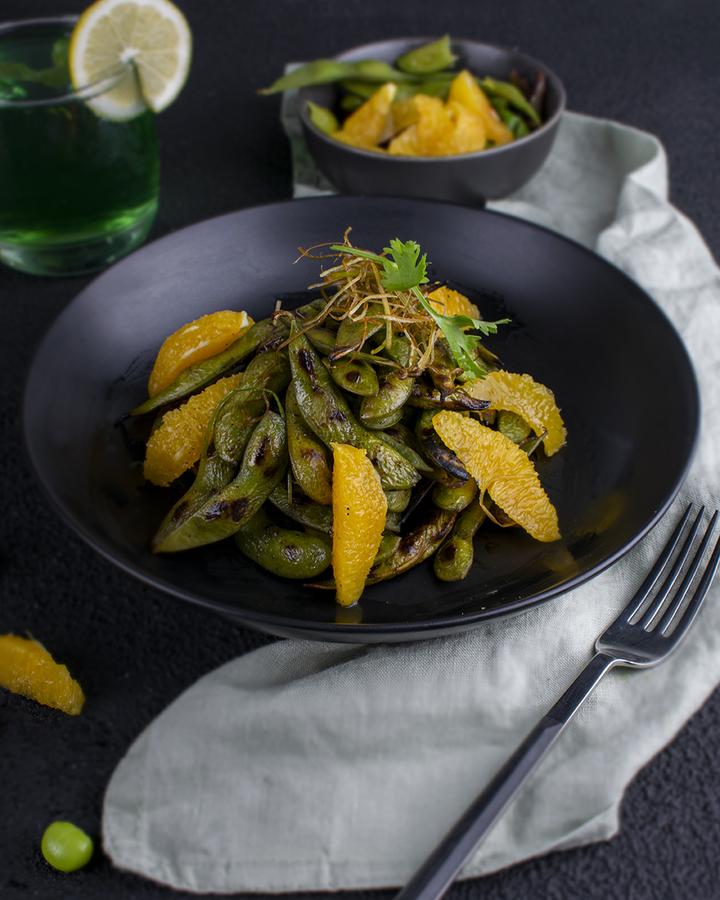 charcoal grilled adamame torched with sauce on the top crispy fried leek,orange and sprinkled salt flex