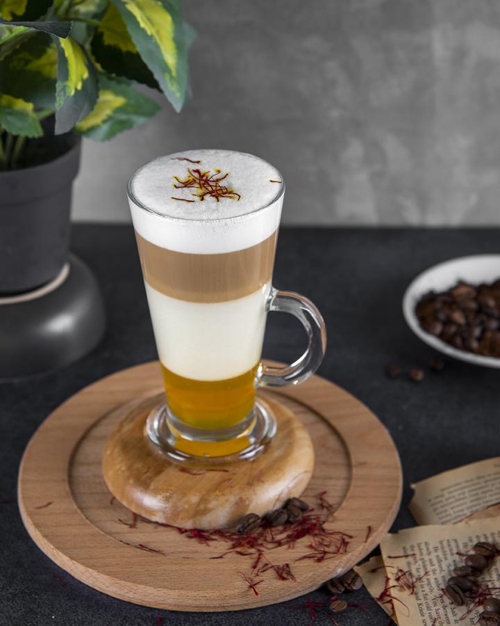 حلوى لذيذة بنكهة الزعفران تقدم مع صلصة الزعفران مغطاة بالكريمة المخفوقة.