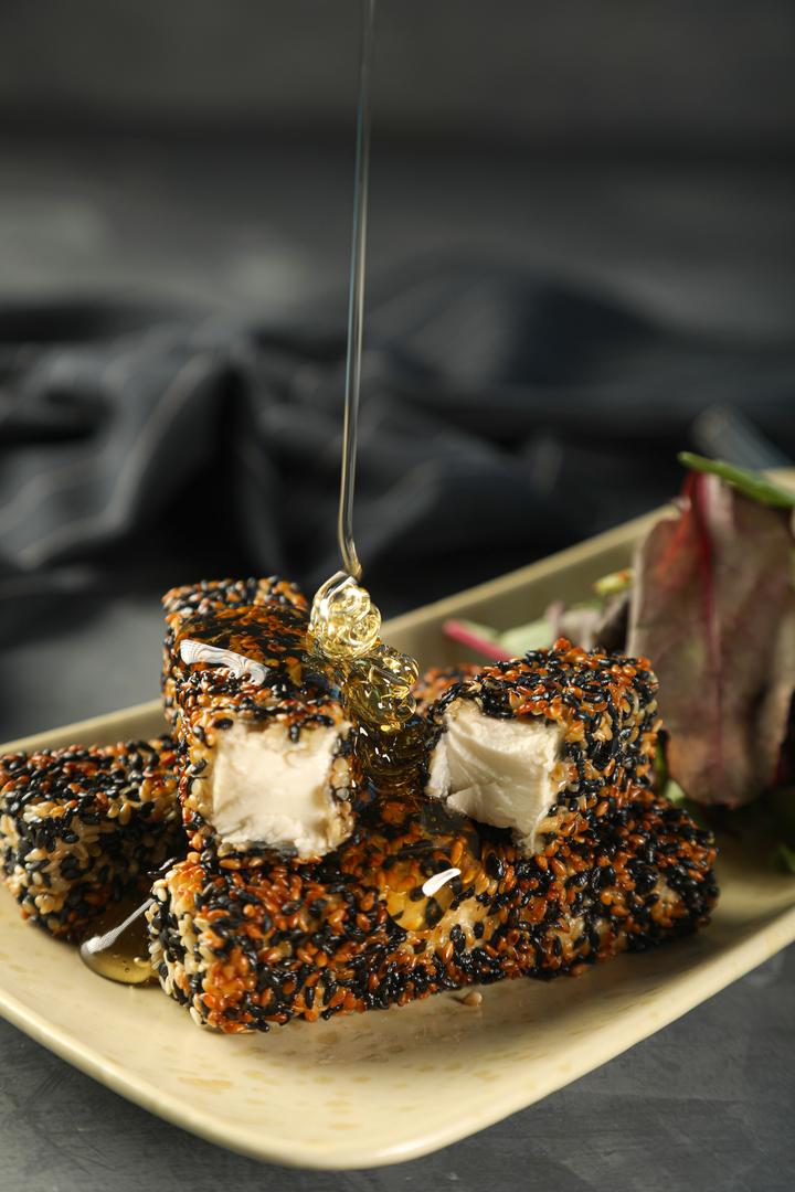 BAKED FETA CHEESE MARINATED AND SOAKED IN HONEY WITH BLACK SESAME SEEDS