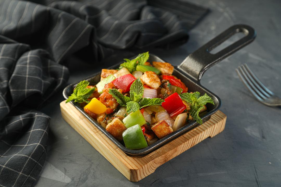 GOLDEN HALLOUMI CHEESE MIX WITH FRESH VEGETABLE (SWEET BELL PEPPER, TOMATO & ONION MIX WITH FRESH MINT LEAVES