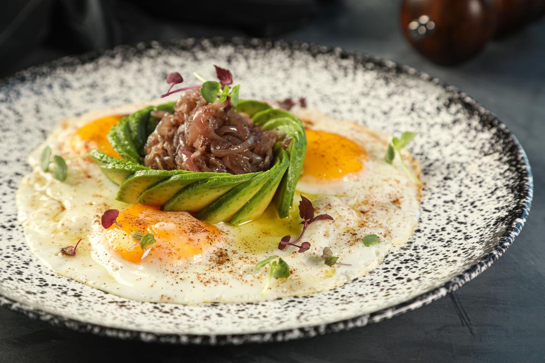 SUNNY SIDE UP EGGS TOPPED WITH MIX SPICES AND LAYER OF AROMATIC ONION CONFIT AND SLICES OF AVOCADO