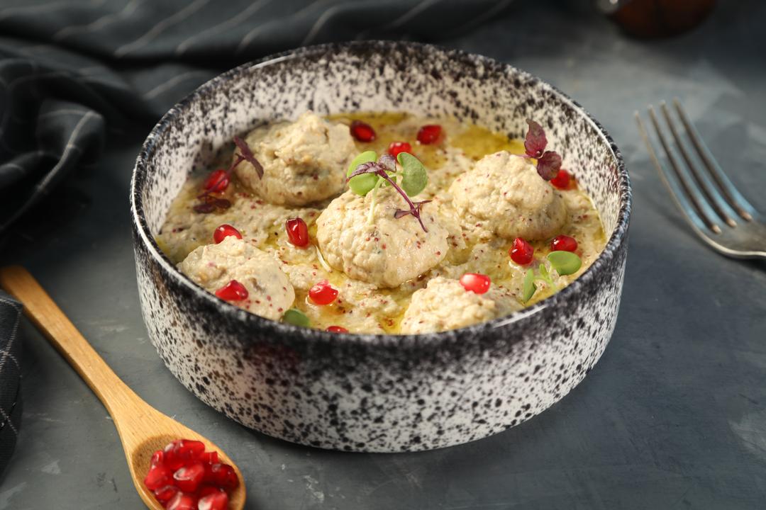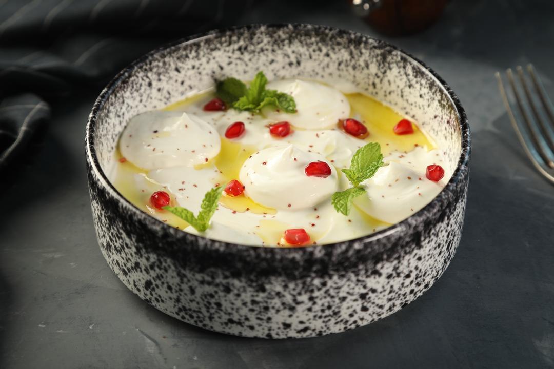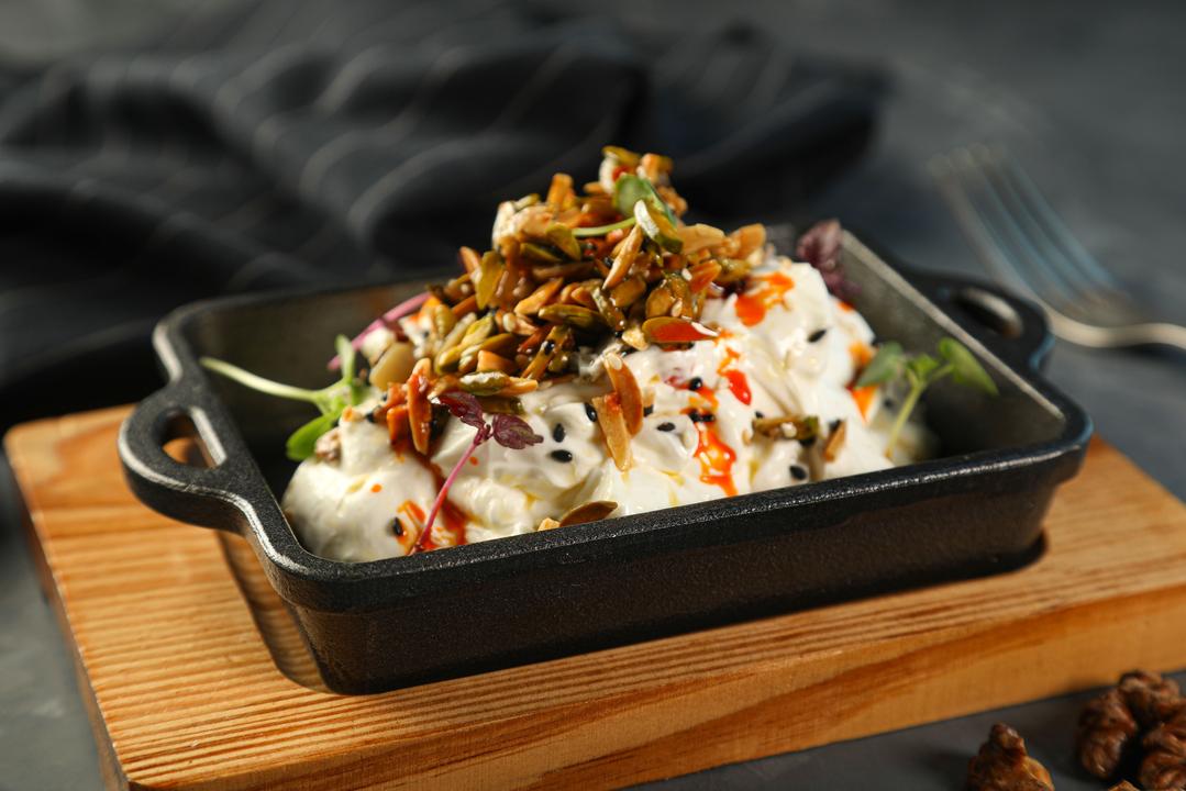FRESH LABNAH TOPPED WITH MIXED NUTS PICKLED EGGPLANT AND DRIZZLE WITH OIL
