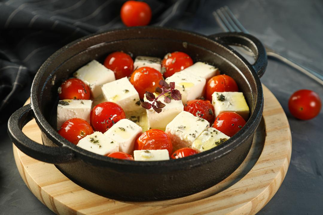 ROASTED FETA CHEESE MIX WITH CHERRY TOMATO TOPPED WITH FINE HERBS AND DRIZZLEDWITH VIRGIN OLIVE OIL.