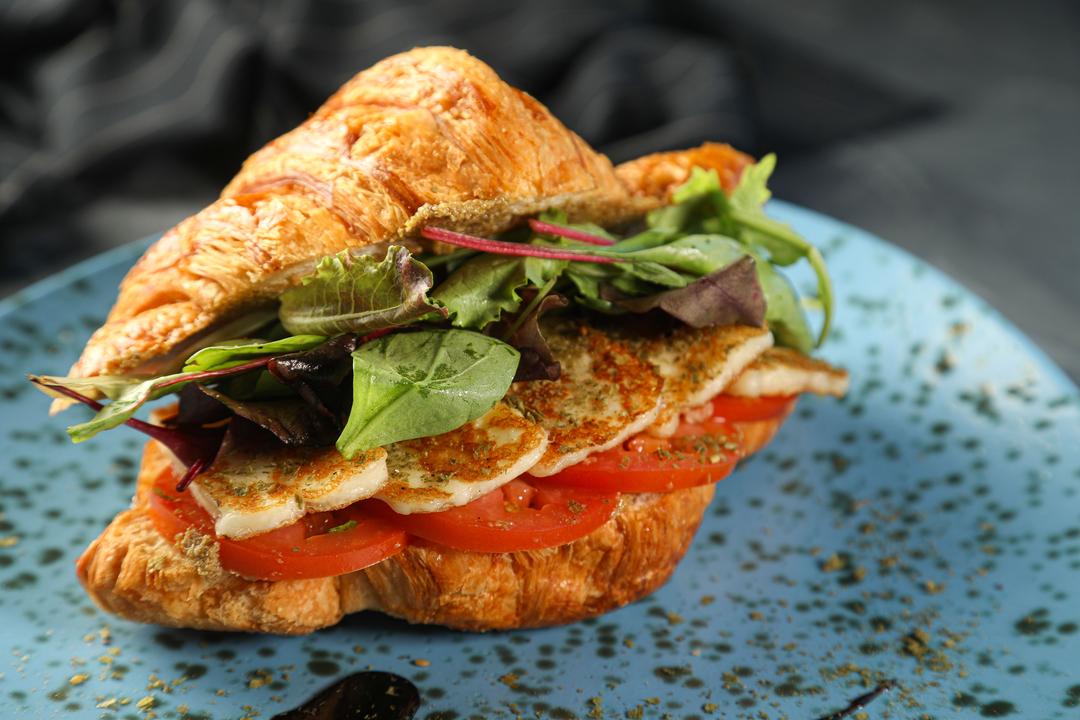 FRESH BAKED CROISSANT FILLED WITH OLIVE TAPENADE GRILLED HALLOUMI FRESH TOMATO SLICES ARUGULA SPRINKLED WITH ZAATAR ON TOP