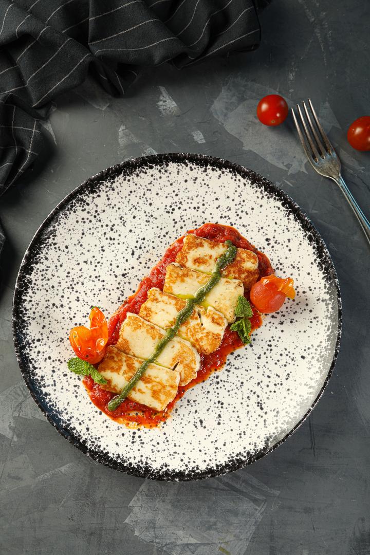 Grilled halloumi in a homemade tomato sauce with cherry tomato and top thyme pesto sauce