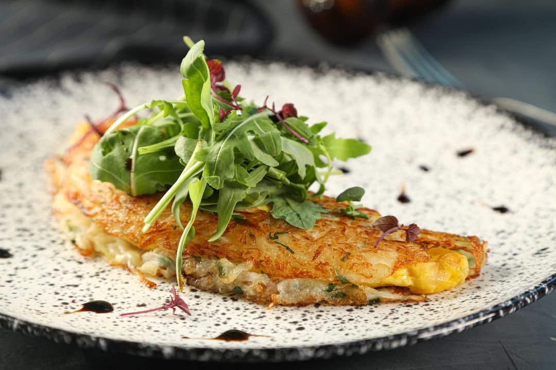 اومليت الجبنة المغطاة بالبطاطا المقرمشة و تقدم مع اوراق الجرجير