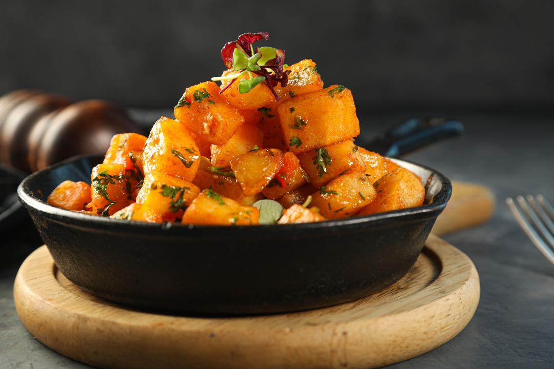 CUBES OF GOLDEN POTATO MIX WITH FRESH HERBS AND OUR SPECIAL SPICES