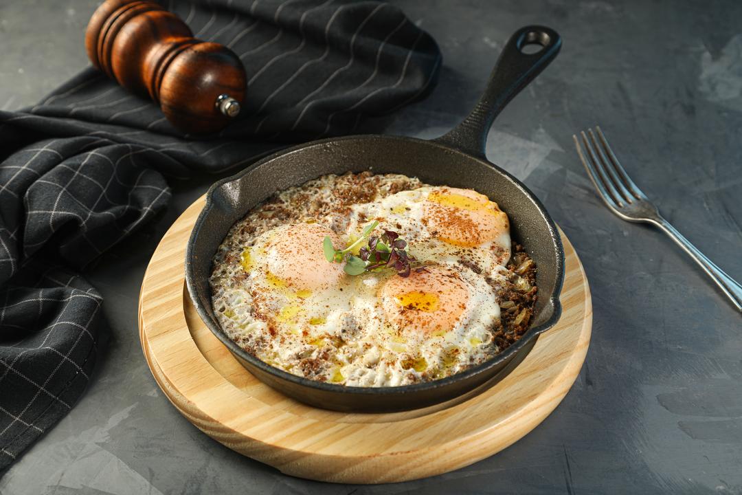 بيض عيون مع لحم الغنم المقرمش و البهارات الخاصة