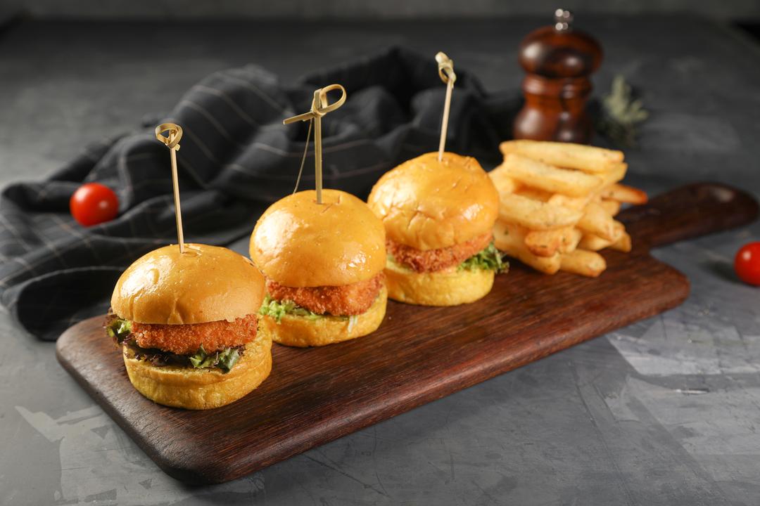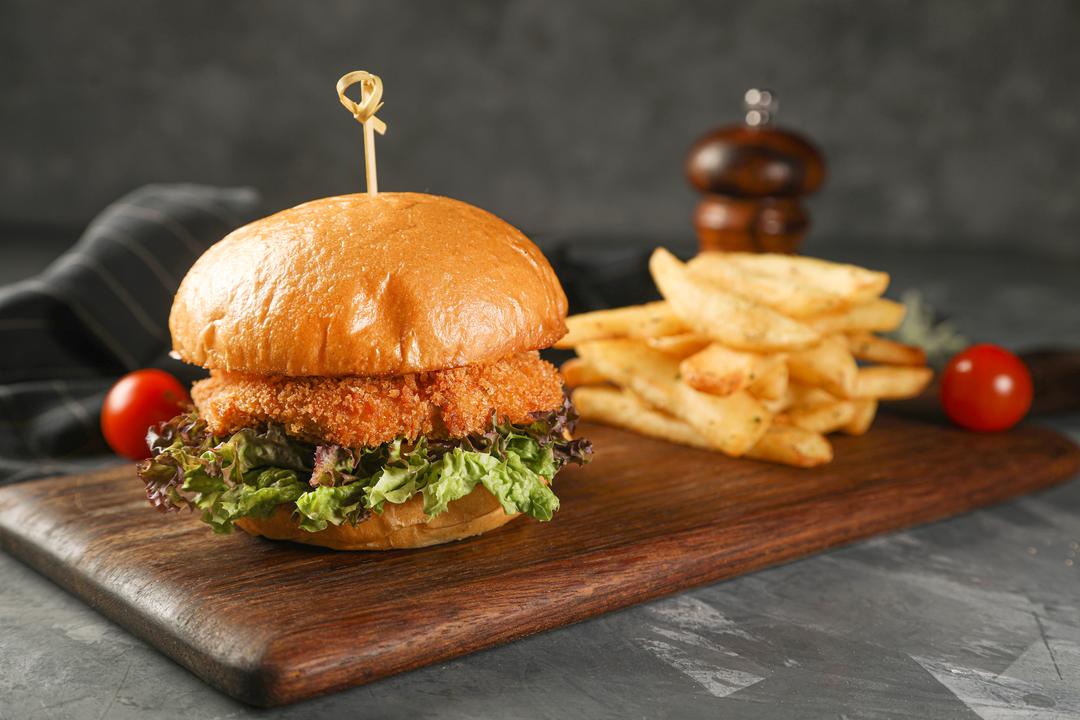 FRIED CHICKEN BREAST, WITH FRESH LETTUCE, TOMATO, ONION, AND PICKLE WITH VIEW SPECIAL BURGER SAUCE SERVED WITH STEAK FRIES.