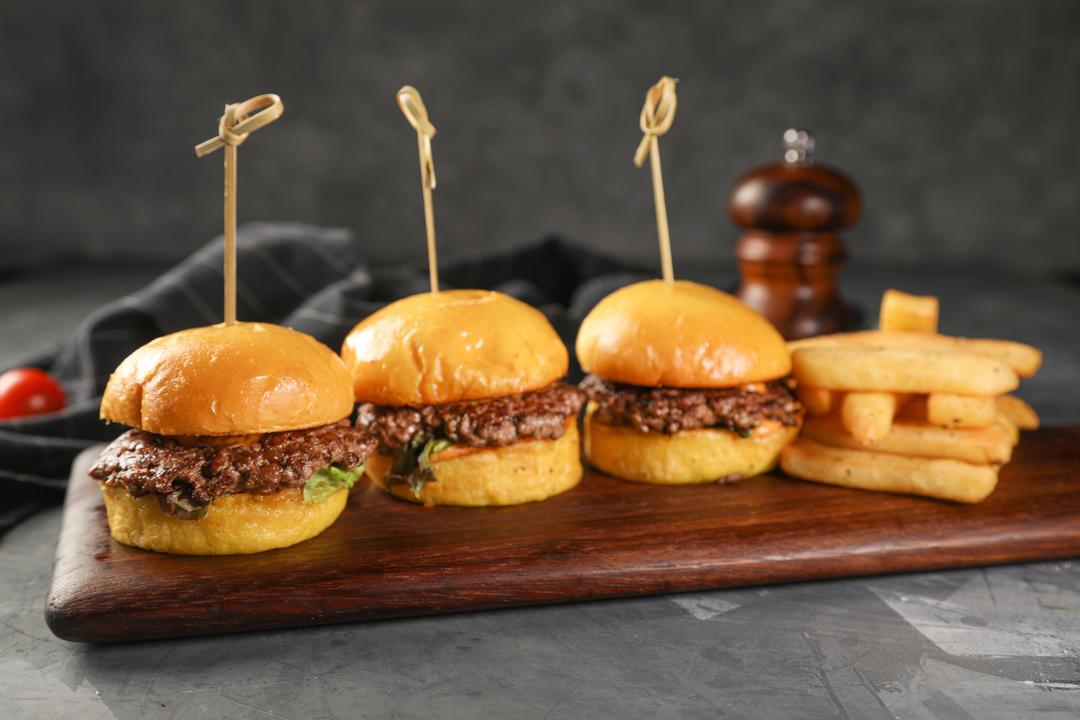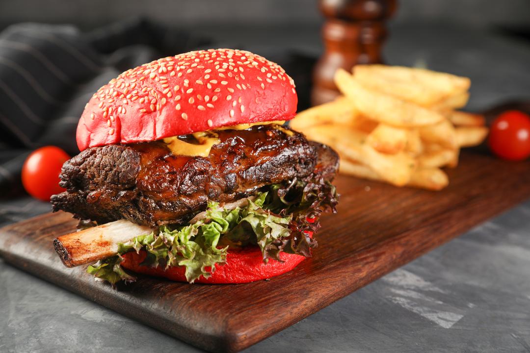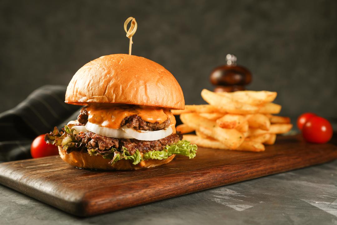 GRILLED BEEF PATTY, WITH CHEDDAR CHEESE, TOMATO AND ONION RINGS PICKLE, FRESH ARUGULA LEAVES MIXED WITH CLASSIC SAUCE SERVED WITH STEAK FRIES.