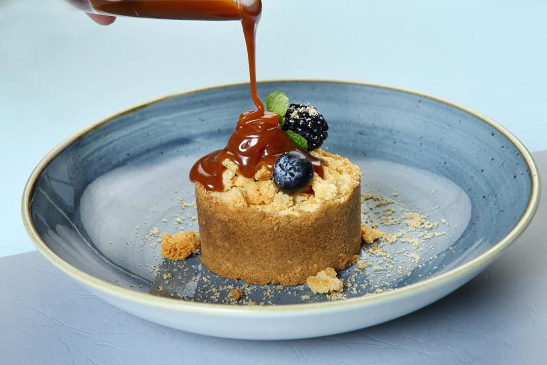 تشيز كيك فيو الخاصة تقدم مع سولتيد كراميل صوص