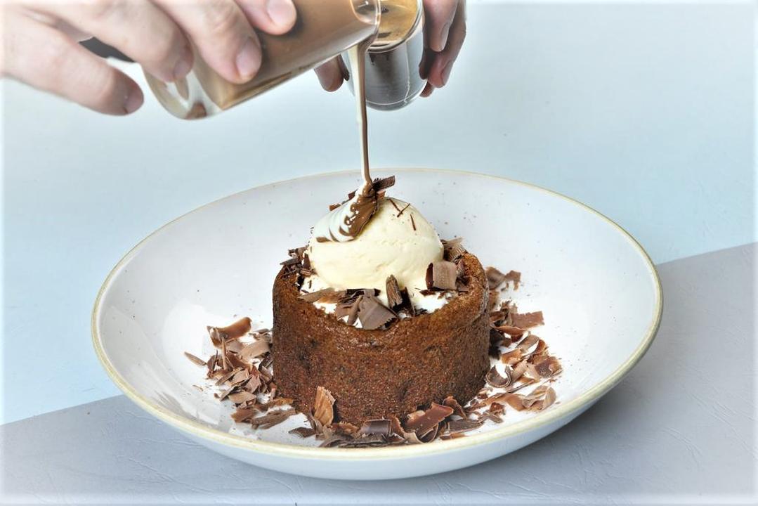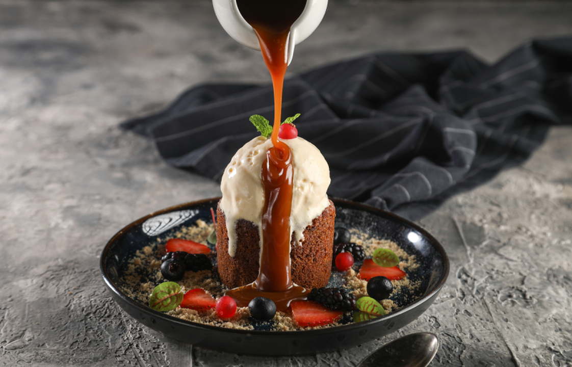 كيكة بودينج التمر يقدم مع صوص الكراميل و ايسكريم فانيلا