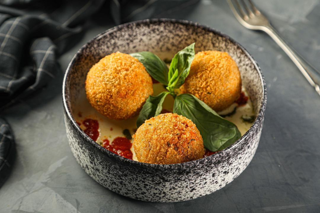 Golden Domes stuffed of meat, cheese & tomato coulis