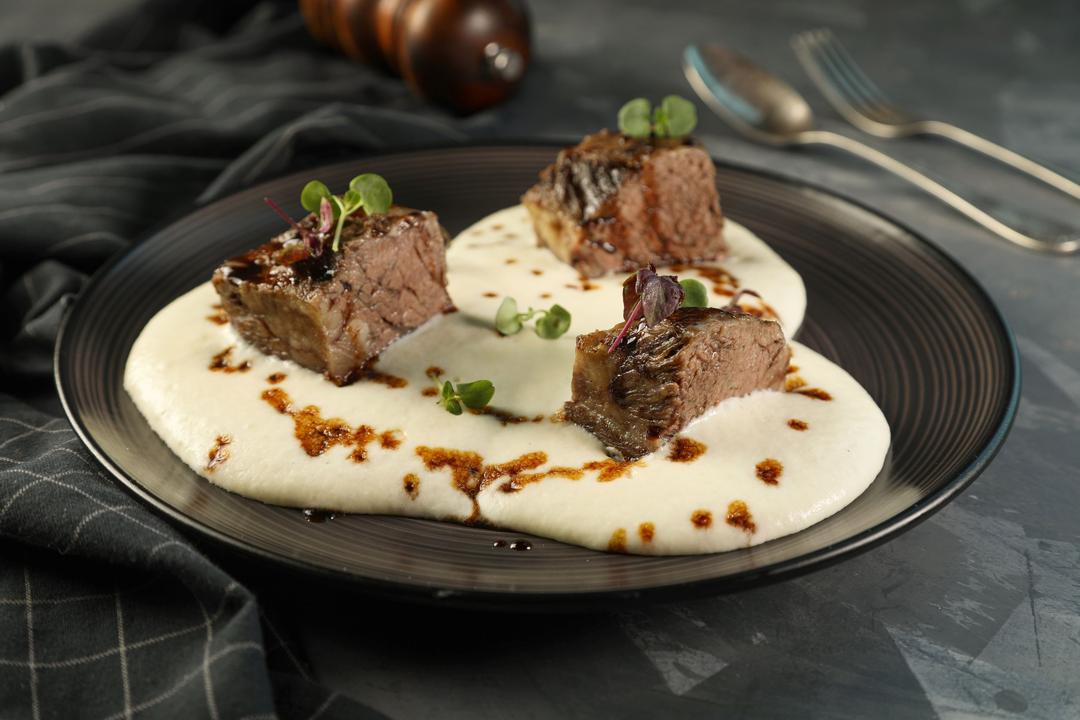 قطع لحم ستيك مع الماش فوم بطاطا