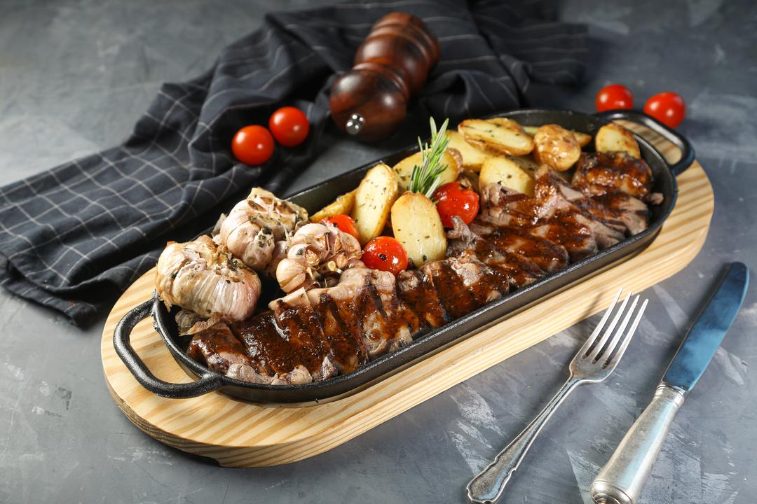 grilled Angus steak served with herbs roast garlic, rosemary baby, potatoes and view steak sauce (Sharing for 2 persons)