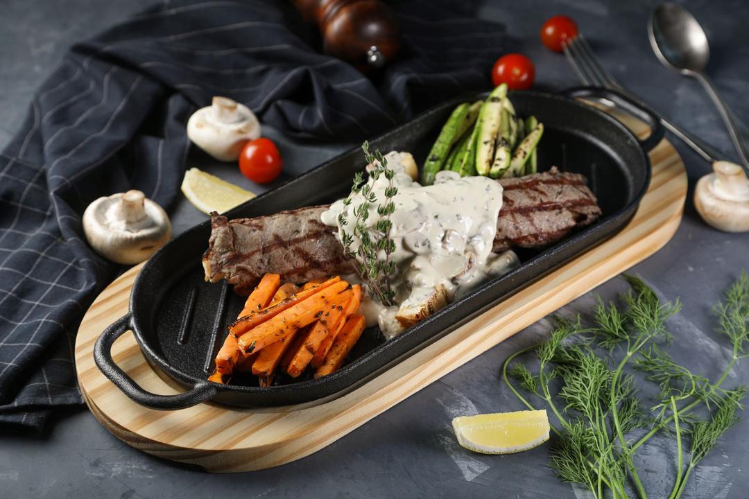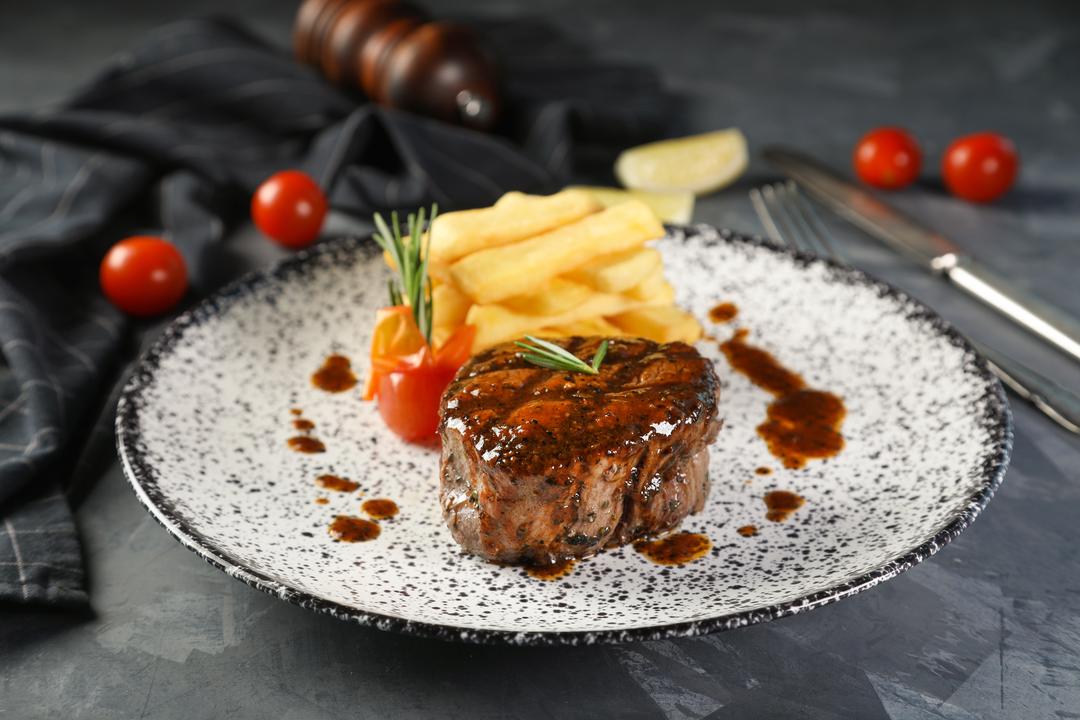 ستيك التندرليون المشوي مع صوص فيو الخاص , ويقدم مع شرائح البطاطا المقلية