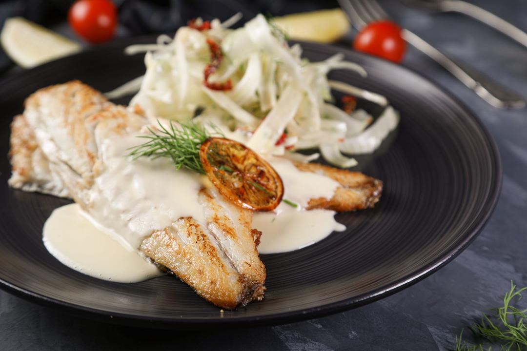سمك السيباس المشوي و يقدم مع صلصة الشمر