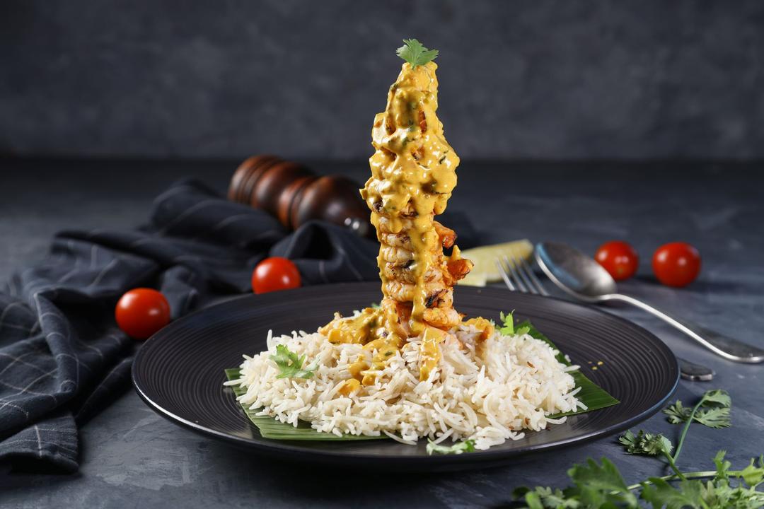 Tiger Shrimps grilled with lemon butter sauce and fresh dill leaves served with cumin rice