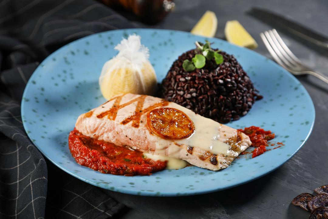 With Black Rice, lemon in net and concasse tomato