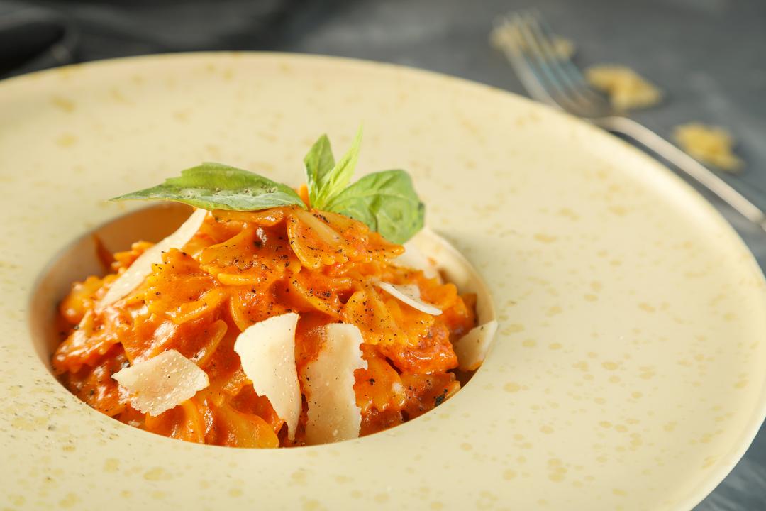 Farfalle Pasta With Pink Sauce, Parmesan Cheese on the Top and Fresh Basil Leaves