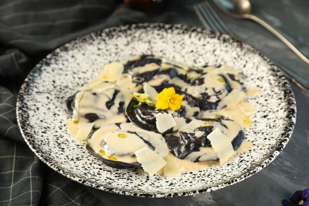 Black Ravioli stuffed with goat cheese and beetroot with mushroom emulsion