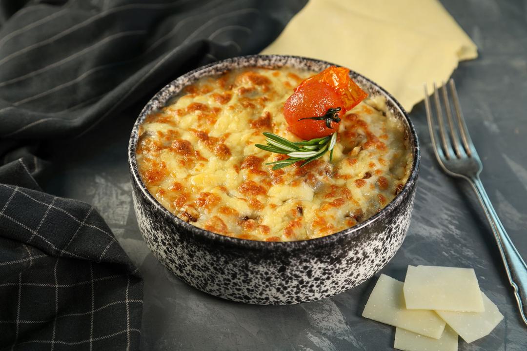 لحم الأضلع المطبوخ بعناية مع 3 انواع من الأجبان و صلصة الكريمة والطماطم الكرزية الطازجة