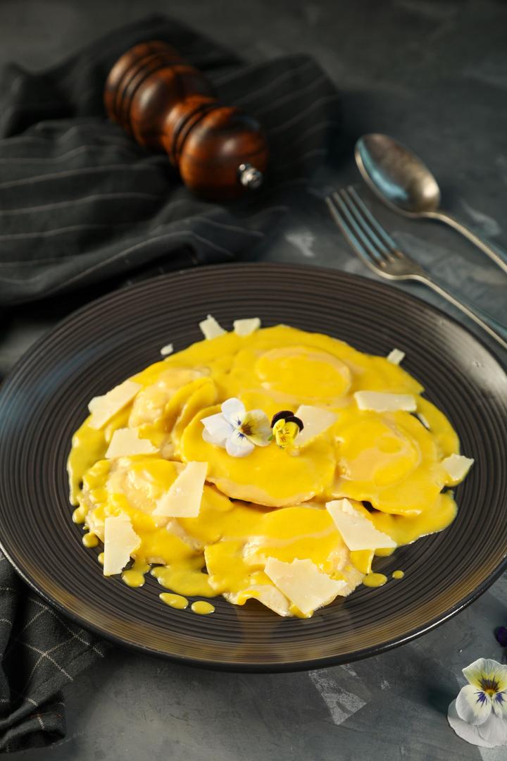 رفيولي محشي بجبنة الريكوتا و المغطاة بصلصة القرع