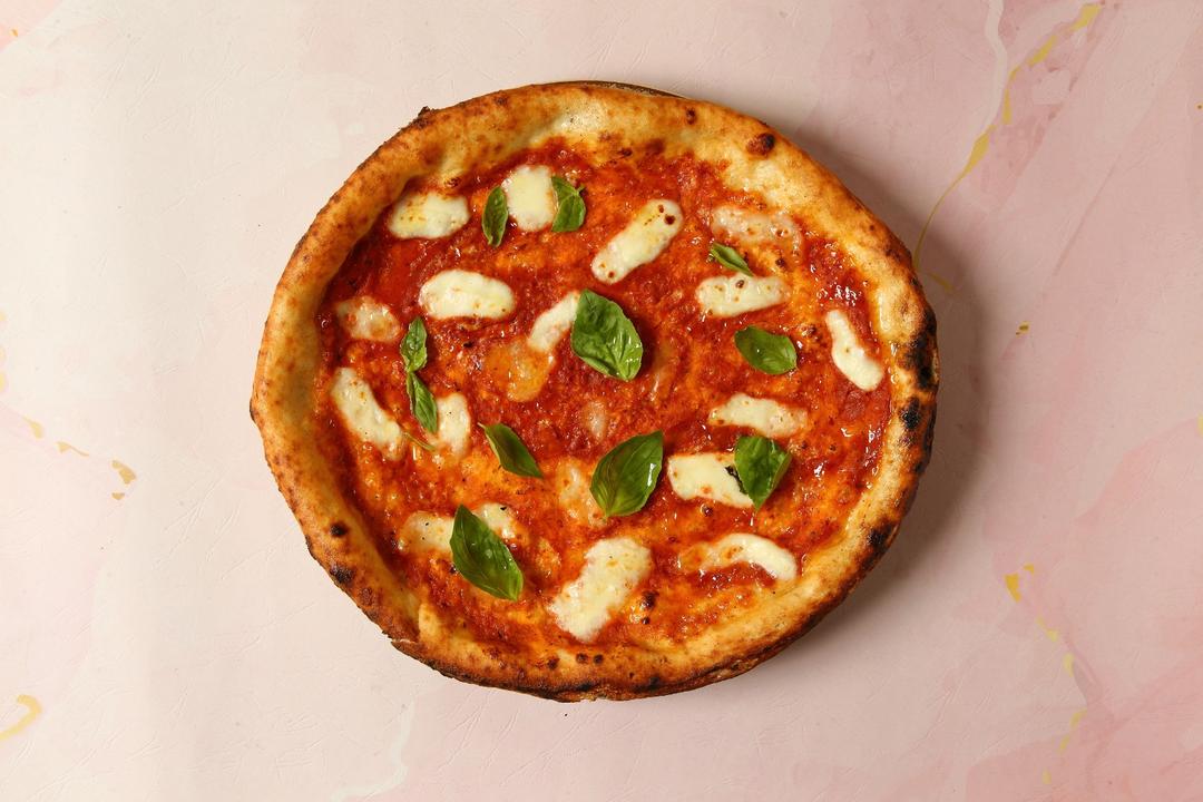 البيتزا المميزة لدينا مع صلصة الطماطم و جبنة الموزريلا الطازجة و أوراق الريحان الطازج