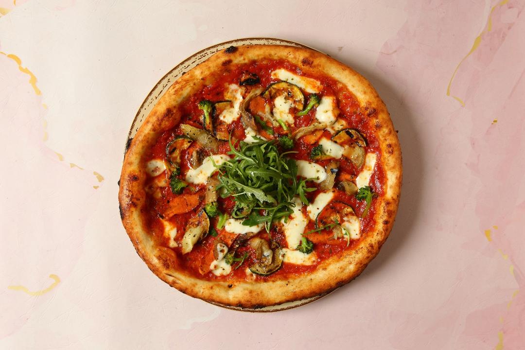 بيتزا الخضار المشوية مع جبنة الموزريلا الطازجة و صلصة الطماطم المميزة و أوراق الريحان الطازجة